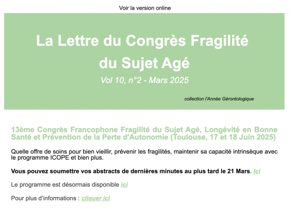 Lettre du Congrès Fragilité du Sujet Agé et Prévention de la Perte d’Autonomie n° 2 – Mars 2025