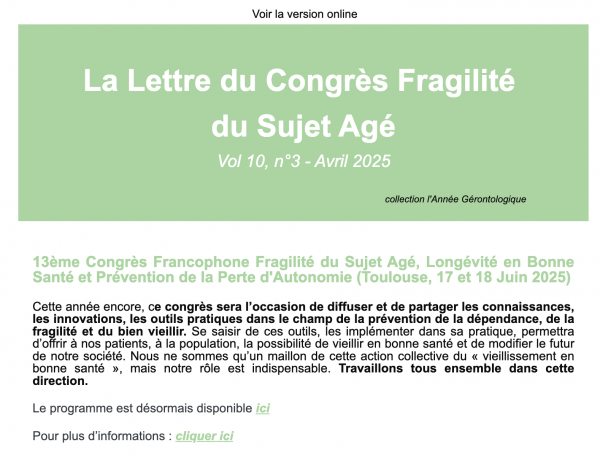 Lettre du Congrès Fragilité du Sujet Agé et Prévention de la Perte d’Autonomie n° 3 – Avril 2025